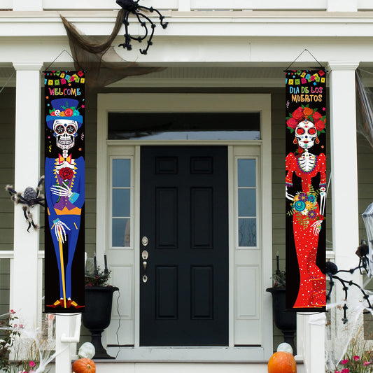 2 Pieces Day of The Dead Porch Sign Dia De Los Muertos Porch Decorations 11.8 x 70.9 Inch Autumn Mexico Welcome Halloween Door Banner Fall Hanging Wall Banner for Festival Indoor Outdoor Decoration