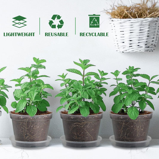 7 Pack 8 Inch Clear Nursery Pots with Saucer, Transparent Plastic Plant Pot with Drainage Holes, Sturdy Plant Starter Pots, Planter Pot for Planting Succulent Flower Herb Vegetable, Gardening Gifts