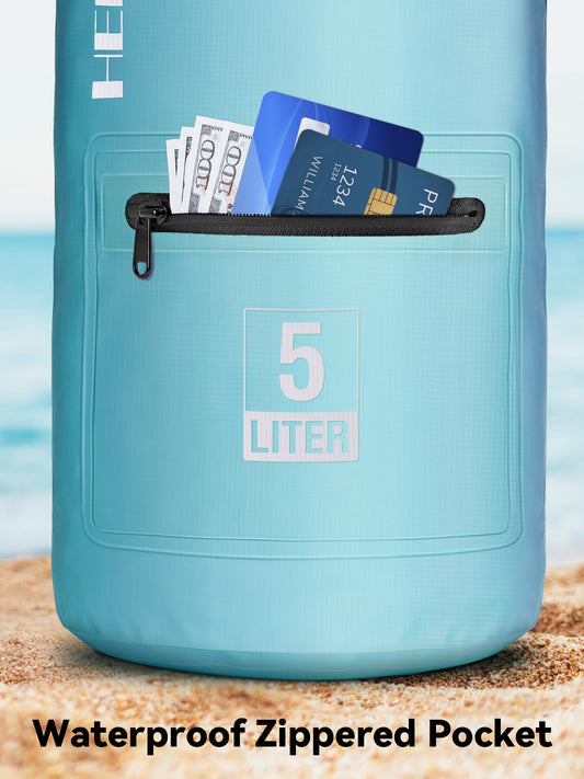 HEETA Waterproof Dry Bag with Front Zippered Pocket for Women Men, 5L/10L/20L/30L/40L Roll Top Lightweight Dry Storage Bag Backpack for Travel, Kayaking, Boating, Rafting, Camping, Beach (Blue, 5L)
