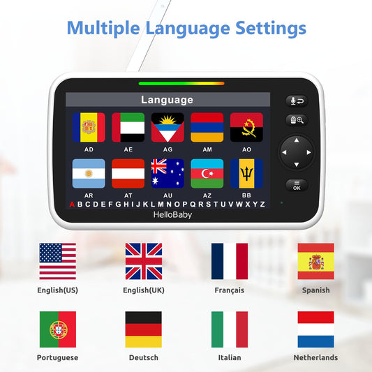 HelloBaby 5’’ Baby Monitor with 26-Hour Battery, 2 Cameras Pan-Tilt-Zoom, 1000ft Range Video Audio Baby Monitor No WiFi, VOX, Night Vision, 2-Way Talk, 8 Languages and Baby Registry Search