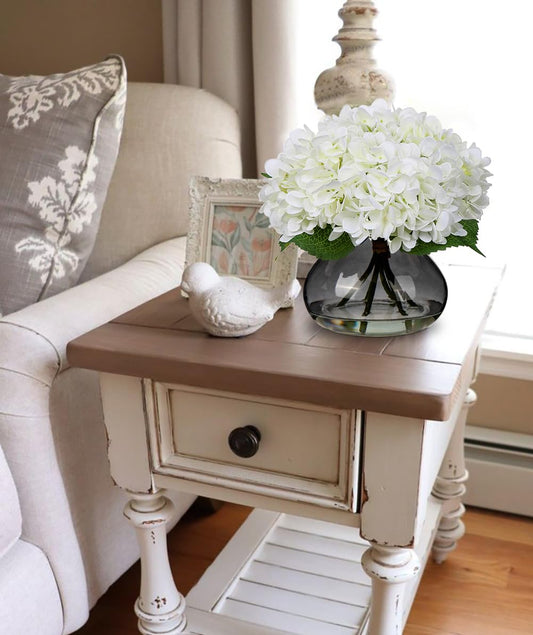 Hollyone Hydrangea Artificial Flowers with Glass Vase White Silk Faux Flowers Arrangements with Faux Water Fake Floral Bulk Bouquet for Home Decor Table Centerpiece Decorations