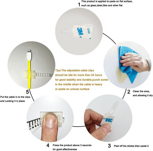 HS Wire Management Clips Clear with Screw Hole (50 Pack) Adjustable Cable Straps 3 Inch with 3M Adhesive Tape,Cable Fasteners for Christmas Lights,Desk,Wall to Hold Extension Cord
