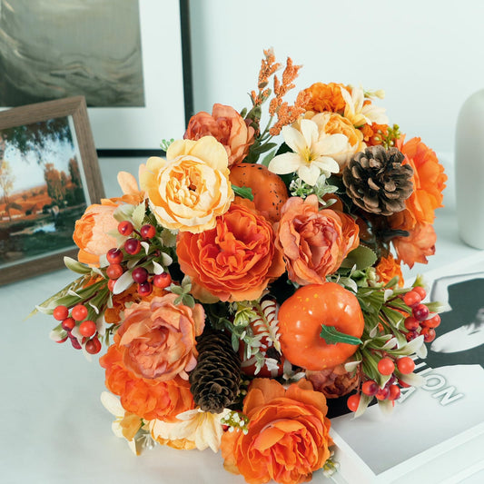 HUAESIN 10PCS Artificial Fall Flowers for Decoration Fall Decor Silk Flowers Bouquet Orange Fake Roses with Pumpkin Silk Autumn Floral Arrangements for Home Table Centerpieces Thanksgiving Decor