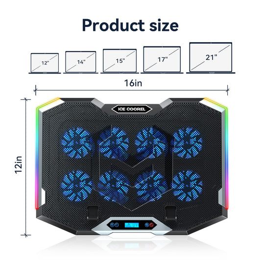 ICE COOREL Gaming Laptop Cooling Pad with 8 Cooling Fans, Laptop Fan Cooler Pad for 15-17.3 Inch, Notebook Cooler Stand with 6 Height Adjustable, RGB Cooling Pad with Two USB Port + Phone Stand