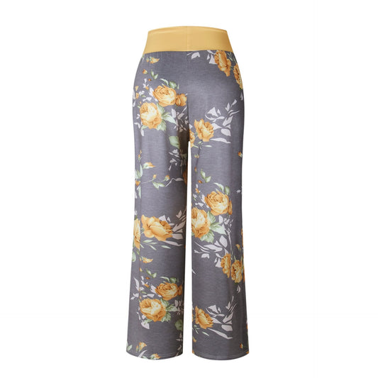 iChunhua Women's Comfy Stretch Floral Print Drawstring Palazzo Wide Leg Lounge Pants(XL,Yellow)