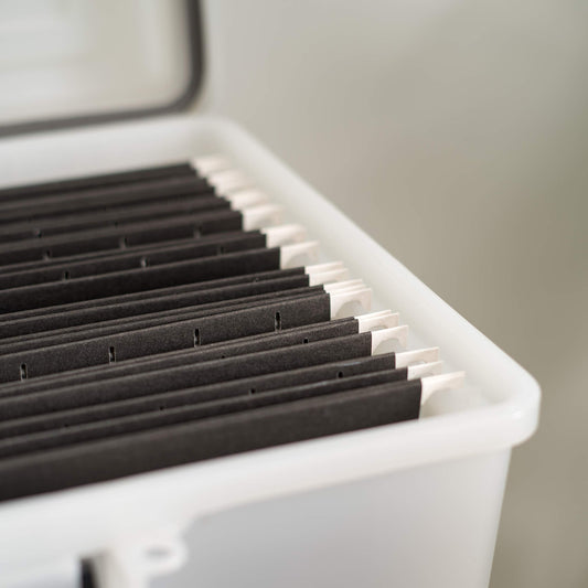 IRIS USA File Box WeatherPro Portable File Organizer Plastic File Box for Letter File w/ Organizer-Lid, Durable Lid and Seal w/ Secure Latching Buckles, Stackable and Nestable, Pearl 19 Qt. 1 Pack