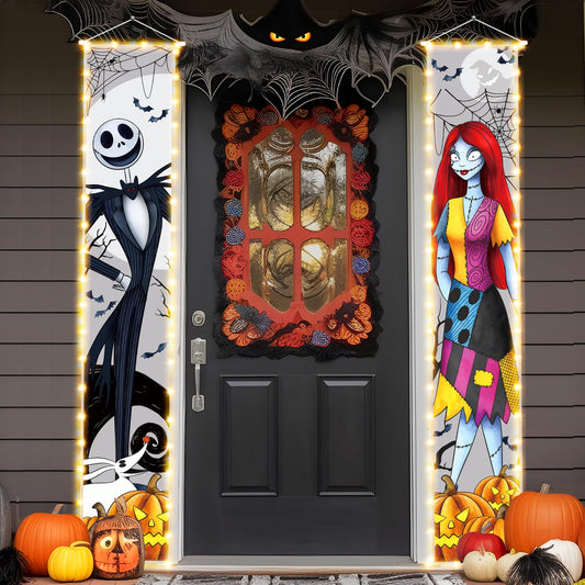 Jack Sally Lighted Banners Porch Signs Halloween Decor Christmas Nightmare Hanging Banner Halloween Decorations Outdoor Horror Poster for Indoor Before Party Wall Art Wallpaper Lights