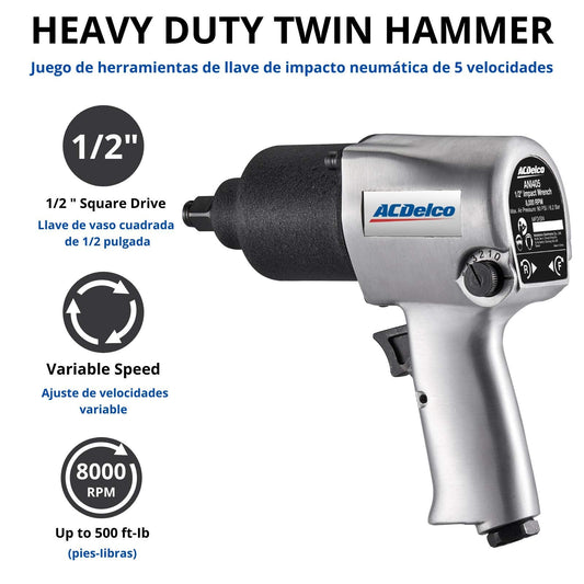ACDelco ANI405A Heavy Duty Twin Hammer ½” 500 ft-lbs. 5-Speed Pneumatic Impact Wrench Tool Kit