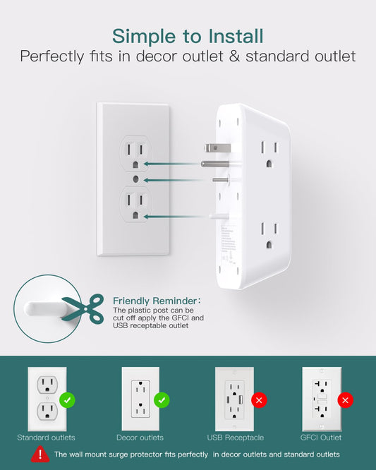 Addtam Surge Protector Outlet Extender, 6-Outlet Splitter with 4 USB Wall Charger(2 USB-C Ports), Multi Plug Wall Outlet 1800J Power Strip for Home Office Dorm Room Essentials