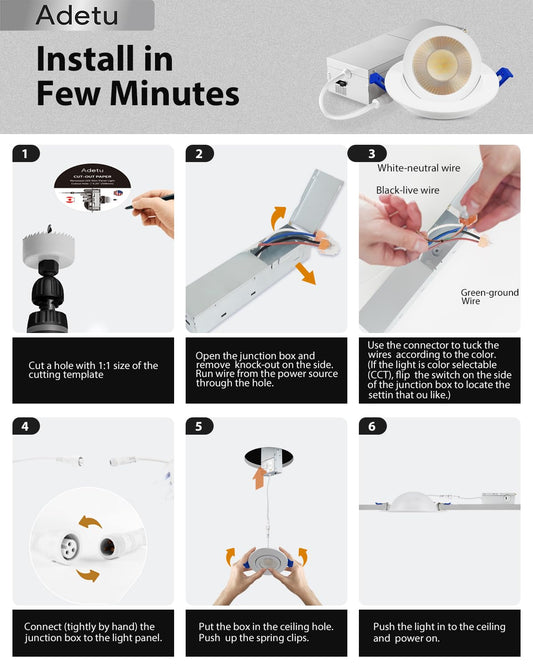 Adetu 2 Inch 5CCT Gimbal Led Recessed Lighting with Junction Box, 360°+90° Adjustable Recessed Can Lights, 2700K/3000K/3500K/4000K/5000K Selectable, 5W Eqv 50W, 550LM Brightness - ETL (White,12 Pack)