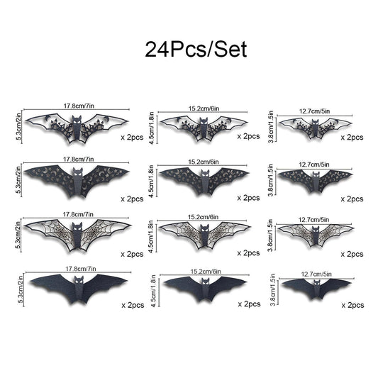 24Pcs Large Halloween Bats Decorations - 3D Self-Adhesive PVC Scary Wall Decor, Hollow Out Waterproof Black Stickers for Indoor Party Supplies, Door and Room Decals