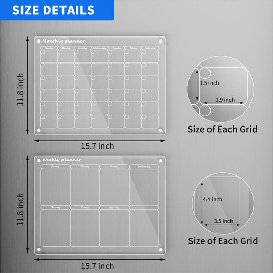 AITEE Acrylic Magnetic Monthly and Weekly Calendar for Fridge, Clear Set of 2 Dry Erase Board Calendar for Fridge Reusable Planner, Includes 6 Dry Erase Markers with 3 Colors(16"x12"Inches)