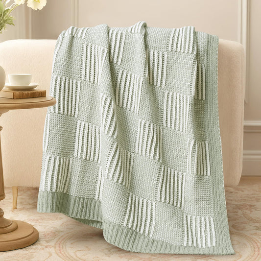 Amélie Home Chenille Knit Throw Blanket for Couch, Checkered Texture Decorative Soft Blanket for Sofa, Bed & Living Room, 50"x60", Sage Green & White