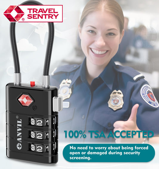 ANVIL TSA Locks for Luggage – TSA Approved Cable Travel Lock with Zinc Alloy Body, 3-Digit Combination Lock for Suitcases, Backpacks, Gun Cases, Zippers (4 Colours)