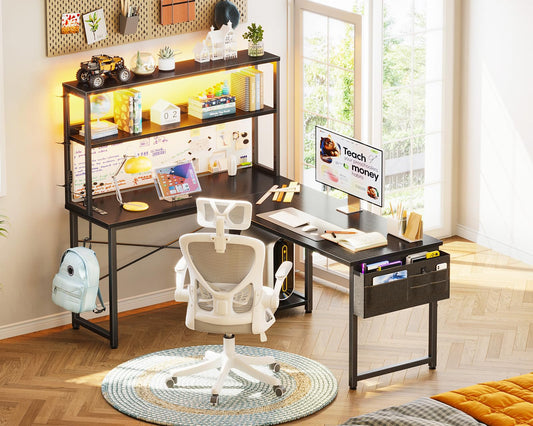 AODK L Shaped Desk Gaming Desk with LED Light & Power Outlet, 53 Inch Reversible L Shaped Computer Table with Shelf & Storage Bag & Hook for Home Office, Black