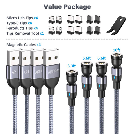 Aripps Magnetic Charging Cable 4 Pack (3.3ft/6.6ft/6.6ft/10ft), 540 Degree Rotating Magnet Phone Charger Cable, 3 in 1 Nylon Braided Magnetic USB Cable for Micro,Type C and iProduct Device