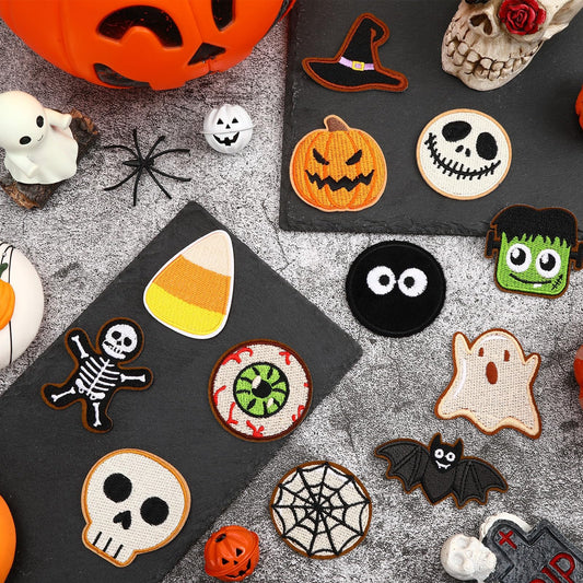 AUGSUN 60pcs Halloween Iron on Patches Random Assorted Halloween Embroidered Sew Applique Repair Patch Cute Skull Pumpkin Ghost Black Cat Witch Bats Patches for Clothing Jacket Dress Backpack Hat