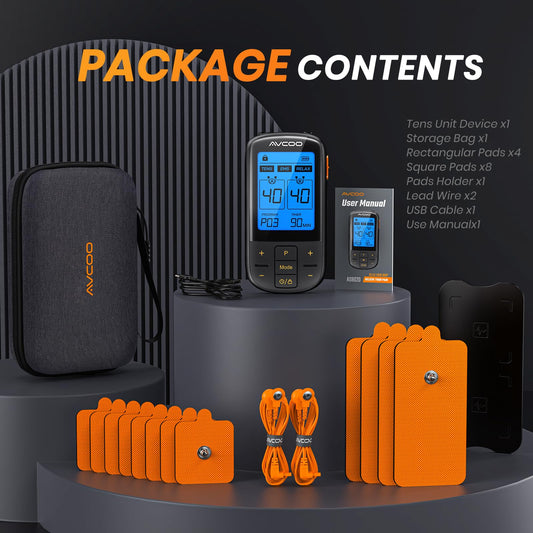 AVCOO 30 Modes TENS EMS Unit Compact Muscle Stimulator for Pain Relief, Rechargeable & Portable Dual Channel EMS Muscle Stimulator with 30 Intensity Levels and 12 Electrode Tens Unit Replacement Pads