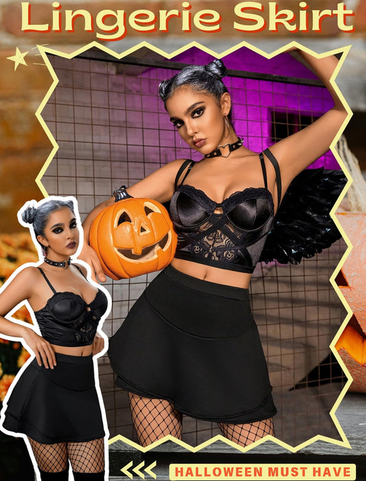 Avidlove Mini Skirt for Women Sexy Ruffle Trim Lingerie Skirt Short High Waist Double Layer Hem Solid Skirt(Black,XL)