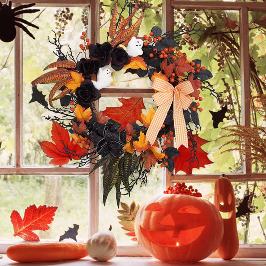 Adeeing 26 Inch Halloween Wreaths for Front Door, Halloween Decorations Ghost Wreath with Feathers Artificial Black Rose and Ribbon for Indoor Outdoor Home Party Decor
