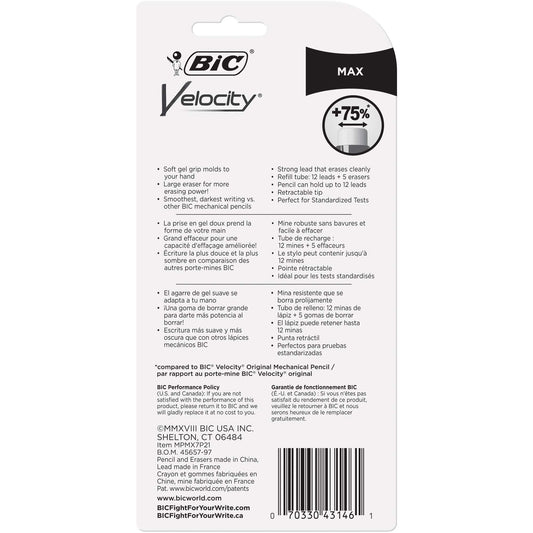 BIC Velocity Max Mechanical Pencils, With Colorful Barrel, Medium Point (0.7mm), 2-Count Pack Mechanical Pencils With Erasers and Lead Refills