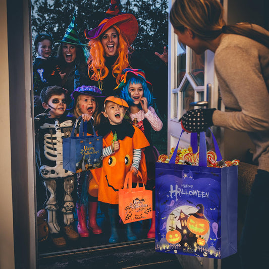 AhfuLife 12 Pcs Halloween Trick or Treat Bags, Candy Tote Bags with Handles, Reusable Non-Woven Gift Bag for Halloween Party Supplies Favors (7.8×7.8×5.9’’)