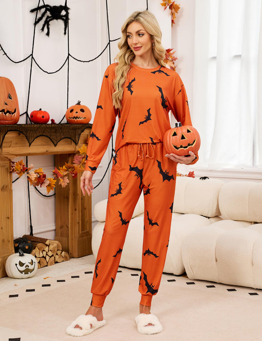 Blooming Jelly Womens Cute Pajama Sets Bat Long Sleeve Halloween Pjs Drawstring Lounge Sets 2025 (M, Orange)
