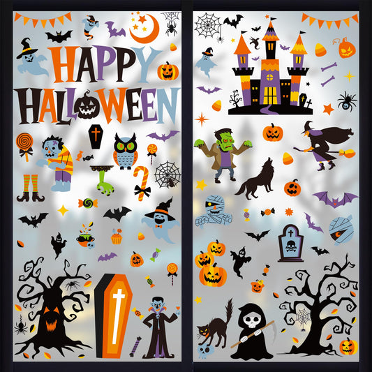 115PCS Halloween Window Clings, 9 Sheets Halloween Decorations, Cute Witch Tree Zombie Ghost Patterns PVC Window Stickers for Treat or Trick Party Favors Decal Supplies Decor Accessories