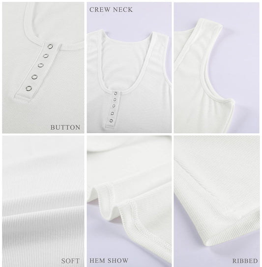 BTFBM Women's Summer Ribbed Tank Tops Crew Neck Button Down Slim Fit Basic Sleeveless Tunic Blouse Casual Henley Shirts(White, Large)