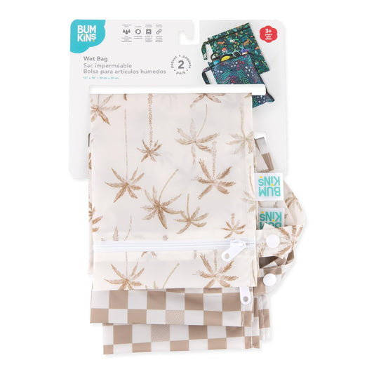 Bumkins Waterproof Wet Bag for Baby, Travel, Swim Suit, Cloth Diapers, Pump Parts, Pool, Beach, Gym Clothes, Toiletry, Hook to Stroller, Daycare, Zip Reusable Wetdry Pack, 2-pk Palm Trees, Beige Check