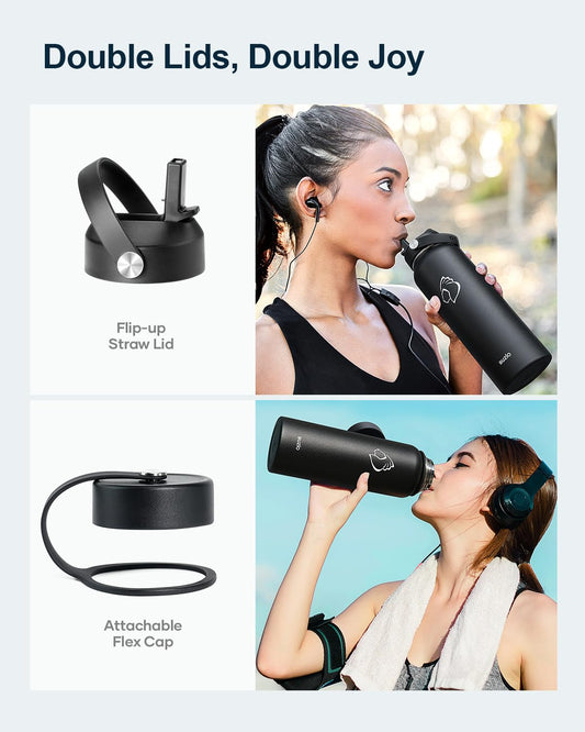 BUZIO 1180ml Insulated Water Bottle with Straw Lid and Flex Cap, 40oz Stainless Steel Drinking Bottle (Keep Cold 48 Hrs/Hot 24 Hrs) Metal Flask Leakproof Wide Mouth Thermo Canteen for Sports, Black