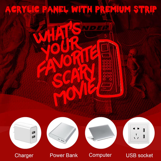What’s Your Favorite Scary Movie Neon Sign – Red LED Wall Light with Retro Phone Design – Horror Movie Night & Halloween Party Décor