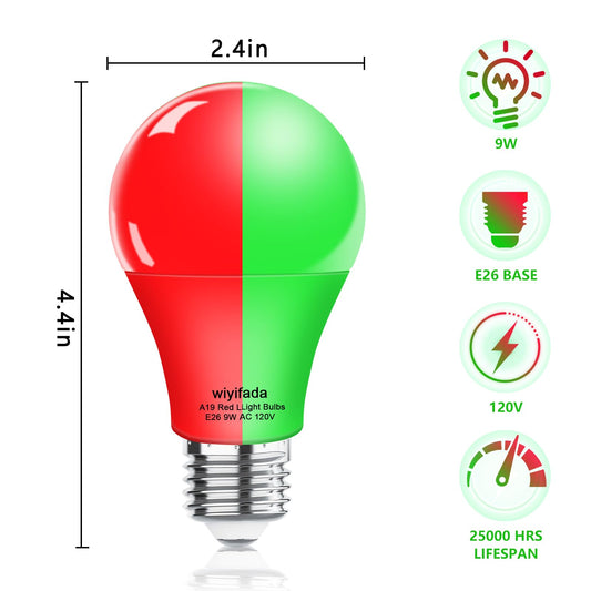 Wiyifada 2 Pack A19 LED Red Green Light Bulbs,9W Christmas Light Bulbs Replace to 100W, 120V E26 Dimmable Colored Light Bulb for Halloween, Home Lighting, Party Decoration, Holiday Lighting