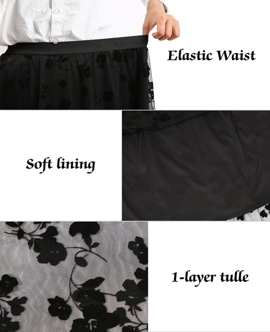 Women's A Line Tulle Midi Skirt Tutu Tiered Petticoat Skirts Tea-Length Elastic Waist Tutu Skirts (Flower Black 2 Layer)