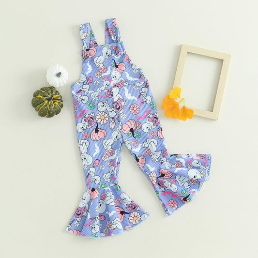 YOKJZJD Toddler Baby Girl Halloween Outfit Pumpkin Ghost Suspender Romper Jumpsuit Overalls Bell Bottom Pants Fall Clothes (Purple, 2-3 Years)