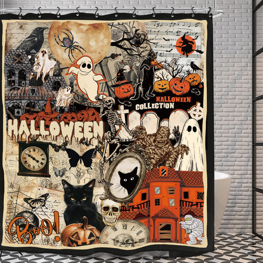 Yookeb Halloween Gothic Cat Bathroom Shower Curtain 60W by 71H Inch Pumpkin Vintage Ghost Skull Horror Scary Retro Spooky Accessory Polyester 12 Hooks Waterproof Decor
