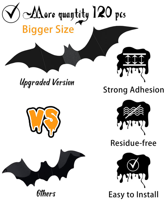 120pcs Halloween Bats Decorations Outdoor Indoor, Halloween Party Supplies, 3D Bat Stickers for Wall Window Home Kitchen Scary Decor (4 Sizes, Black)