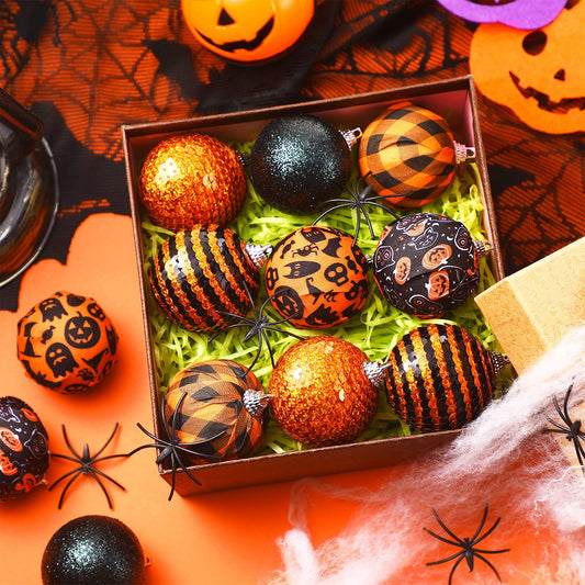 12 Pieces Halloween Ornament for Tree Halloween Day Ball Ornament Glitter Ghost Black Orange Ball Tree Decoration for Party Hanging Decor