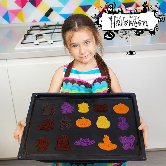16 Pcs Halloween Cookie Cutters, 3D Cookie Cutter with Plunger Stamp, Halloween Cookie Molds -Ghost, Bat, Pumpkin, Cat, Castle,Tombstone, Witch, Spider, Skull, Etc.