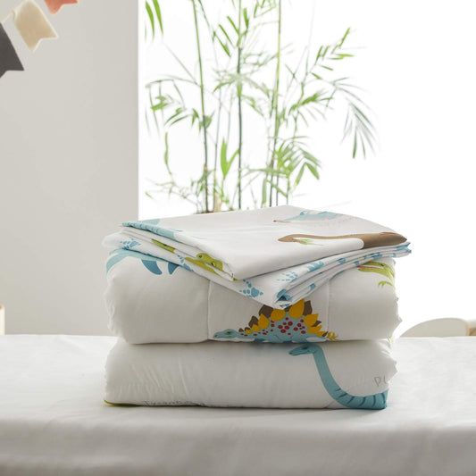 4 Pieces Toddler Bedding Set Dinosaur White with Colorful Dinos and Monsters Toddler Comforter Sheet Set for Autumu and Winter Includes Comforter, Flat Sheet, Fitted Sheet and Pillowcase