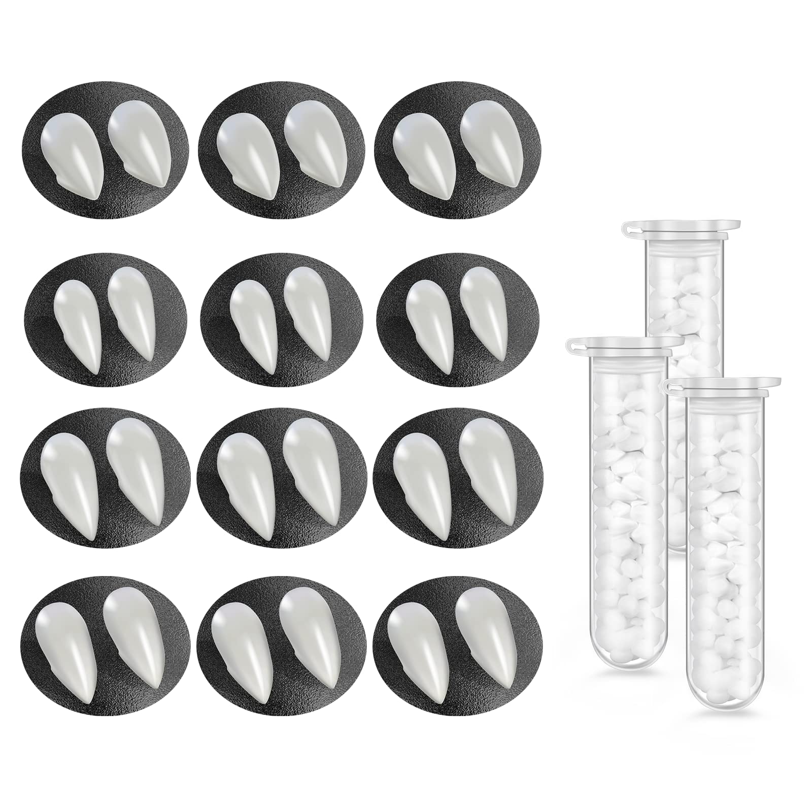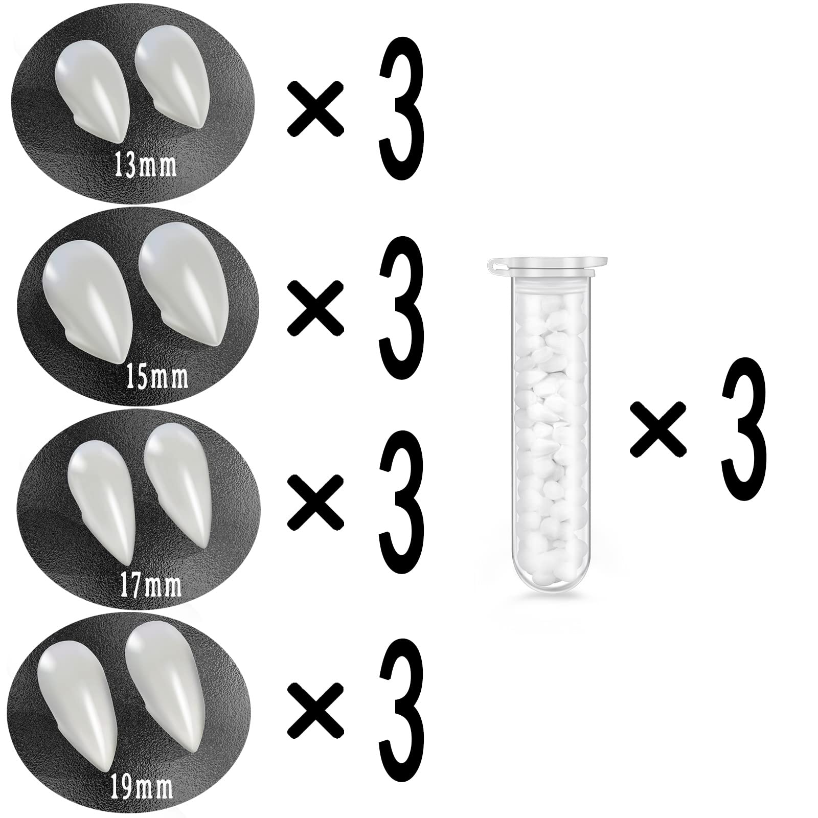 • Sufficient Packaging: You will get 12 different pairs vampire fangs(sizes:3x13mm/3x15mm/3x17mm/3x19mm ) and 3 tube solid teeth adhesive(disposable), meet all your size need.