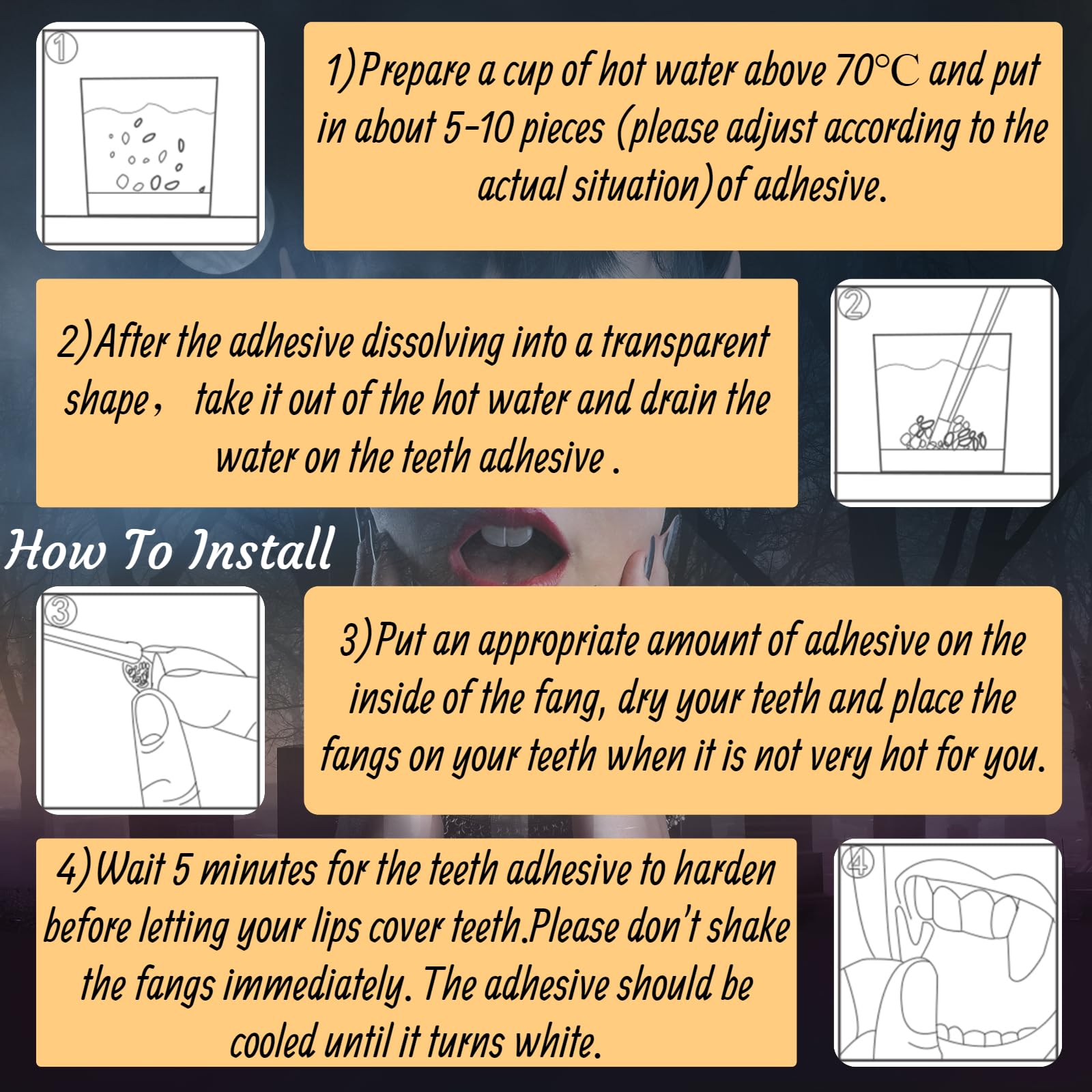• Easy To Use Vampire Fangs: Heat the teeth adhesive beads from white to clear by hot water, then drain the water and press adhesive into the fang, then dry your teeth and place the fangs on your teeth. See attached instructions for details.