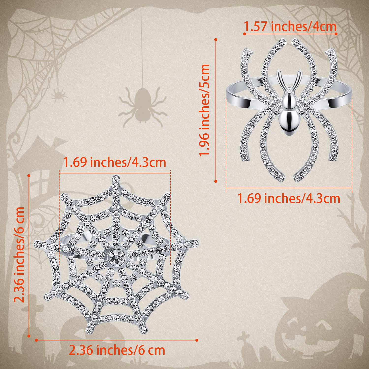 Package includes: 6 x Spider napkin rings (1.96 x 1.57 inches/ 5 x 4 cm) 6 x Spider web napkin rings (2.36 x 2.36 inches/ 6 x 6 cm)
