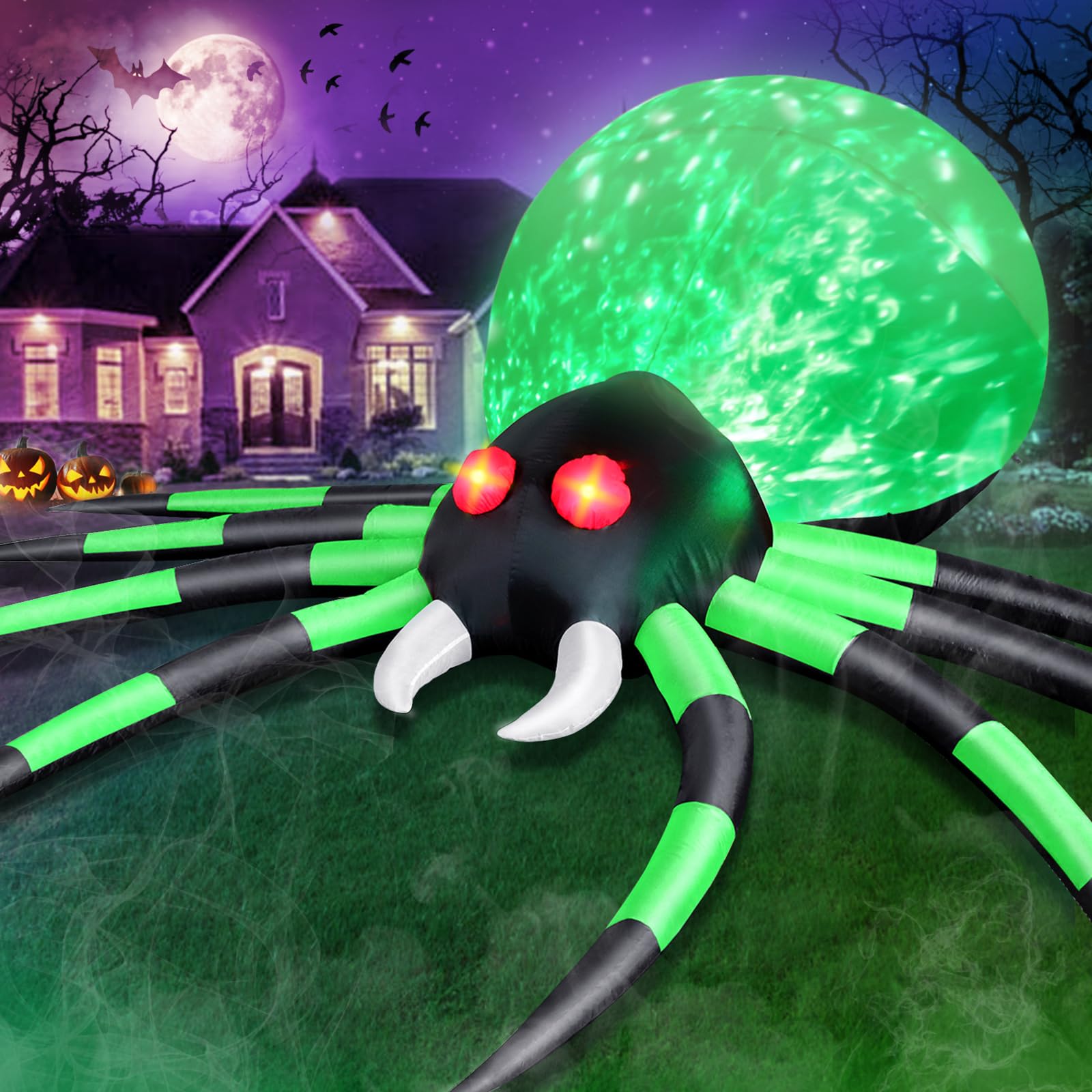 • 💀[12 feet giant inflatable spider with rotating green light] Built-in cool rotatable LED lights, huge body with flashing green light, glowing red eyes, long fangs, black and green legs make the spider look more real , even more terrifying. It will be a visual feast for your neighbors and guests. This Giant Halloween Inflatable Spider is sure to be a hit at any Halloween party!