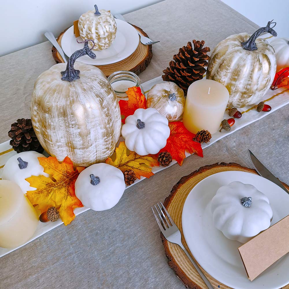 • Quantity: Package includes 14 Pcs Assorted Fall Artificial Pumpkins Harvest Frosted Pumpkins. There are 7 Pcs 5 Sizes Gold Brushed White Foam Pumpkins, 7 Pcs 5 Sizes White Faux Pumpkins.