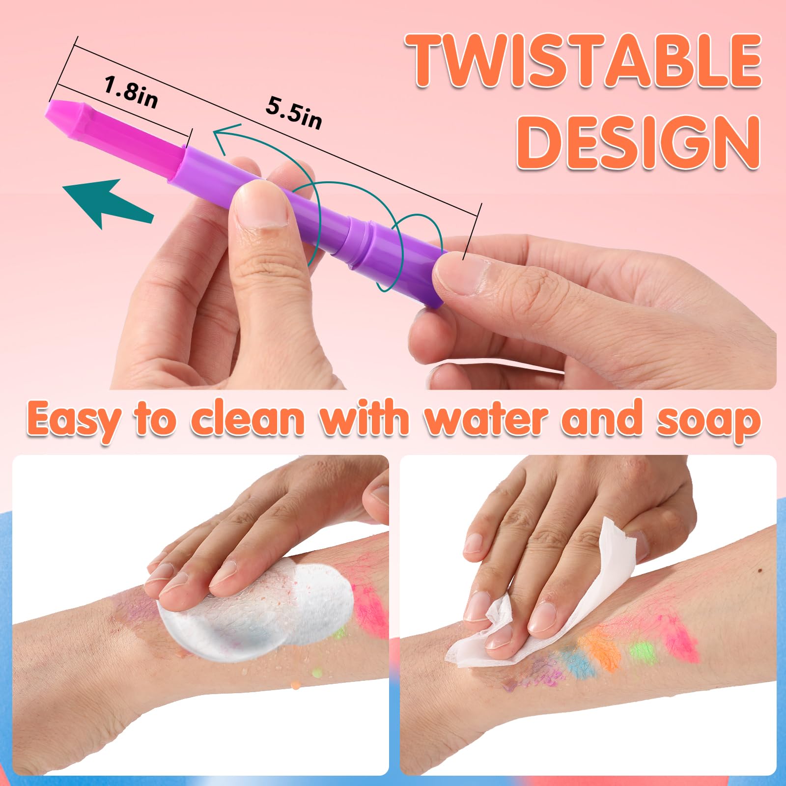 • 【Easy to Color and Clean】The glow face paint sticks adopt a twistable design,which can be easily opened and closed.It can be colored with a light sweep on the skin,making it convenient and time-saving.It is also easy to remove and can be cleaned with water and soap without residue.It is very friendly to beginners.