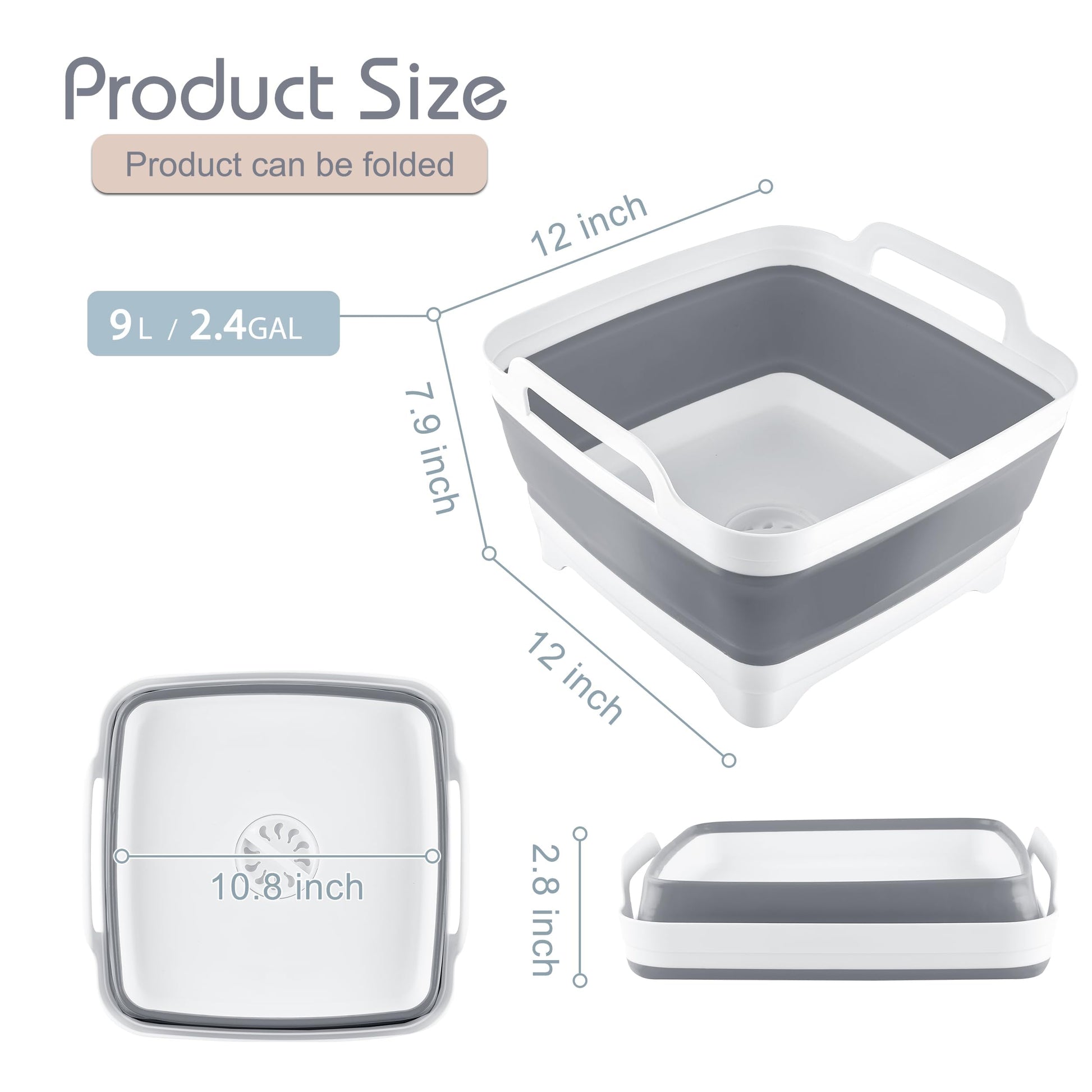 • 【Space-Saving and Foldable】The dish basin feature a foldable design so that you can adjust the size as needed. It collapses easily for storage and takes up very little space.Expanded size:12.4 x 12 x 7.9(h) inches.Collapsed:2.8 inches. The Interior bottom dimension is about 10.1 x 10.1 inches. Capacity: 9L / 2.4 gallon.