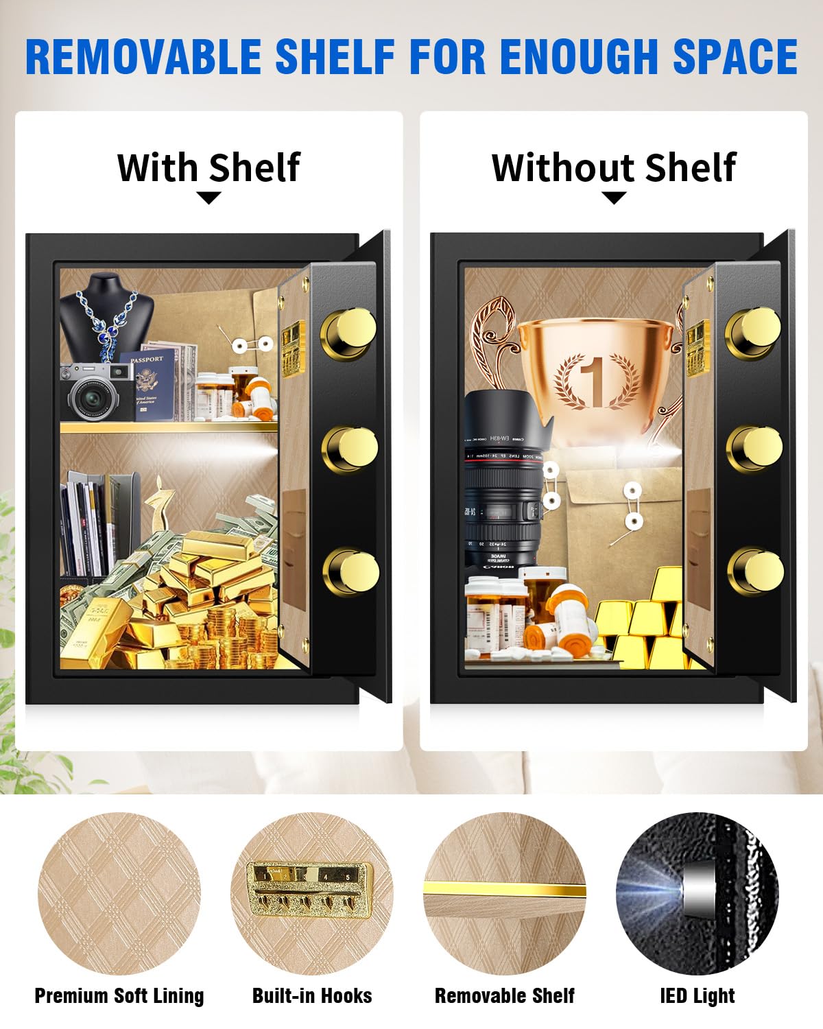 • 【Extra Storage Space】Our large safe provides ample storage space and versatile interior organization. Built-in hooks and ID area help you easily organize important keys, jewelry necklaces, passports, credit cards; removable shelf provide you with flexible storage options, you can take the shelf in or out as needed. We also enhances interior protection with a custom premium interior to keep your important valuables protected from damage during storage.