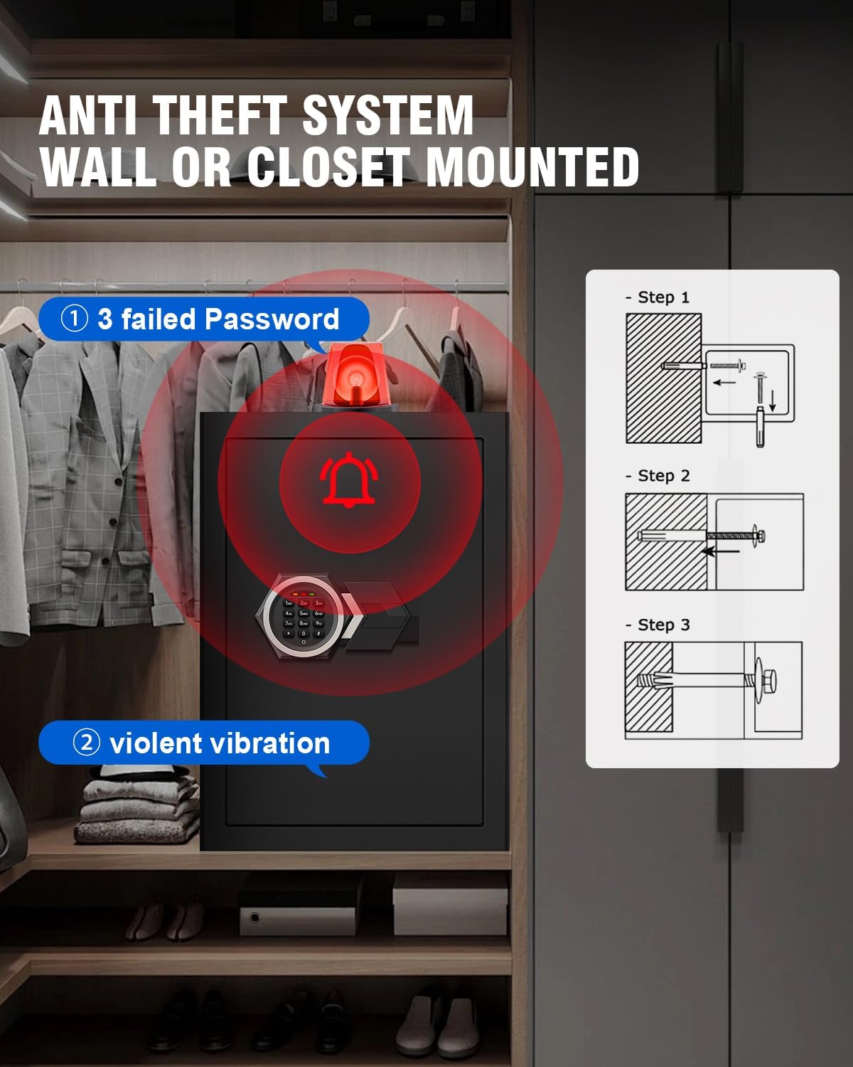 • 【2.8 Cu Ft Heavy Duty & Safe Protection】The safe is made of 60mm ultra-thick heavy duty steel anti-theft door. 30mm high-strength solid locking bolts, anti-pry hidden hinges and recessed door provide physical protection, the advanced locking technology resists physical attacks and lock manipulation to ensure the safety of your valuables. Also,it features pre-drilled mounting holes and comes with screws for mounting the security device to a wall, floor, or closet shelf to further prevent the risk of theft.
