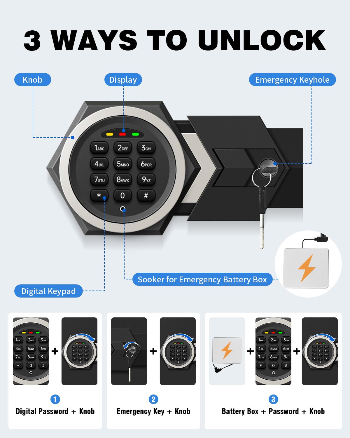• 【Digital Keypad Panel with Combination Lock】This safe box is designed with a programmable digital keypad and emeregency keys, which makes it more flexible and convenient to use. 3 ways to unlock the security safe: ①Personal password+knob; ②Emergency key+knob. When you insert the key into the keyhole, turn the emergency key counterclockwise, and then turn the knob clockwise to open the door.③External battery box design to prevent emergencies when the battery is exhausted and the key is not there.
